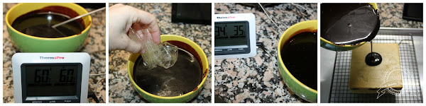 Vertemos el glaseado de chocolate espejo en un bol y dejamos templar hasta los 60ºC y le añadimos la gelatina hidratada y escurrida. Mezclamos hasta que se integre con el chocolate y dejamos enfriar hasta los 30ºC-35ºC. Sacamos nuestra tarta del congelador desmoldamos y bañamos la tarta.
