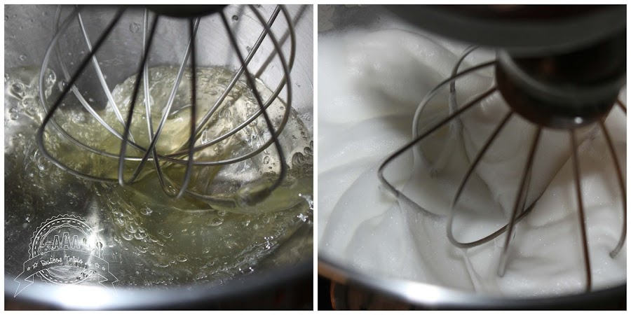 A los 121ºC (más o menos) retiramos el jarabe del fuego, lo agregamos a nuestras yemas ligeramente montadas, poco a poco que resbale por la pared interna del bol de nuestra batidora, para que no caigan directamente sobre las yemas montadas sino podría cortarse nuestra crema, aumentamos la velocidad y seguimos batiendo hasta que la mezcla se enfríe por completo, lo notareis al tocar el bol de la batidora como va perdiendo el calor y se va enfriando.