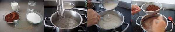 A continuación incorporar el cacao tamizado con un colador, removiendo con las varillas hasta que se integre completamente y obtengamos una mezcla homogénea.