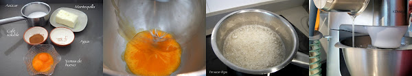 Colocar un cazo al fuego con el azúcar y el agua y preparar un almíbar. Cuando alcance los 118º retirar del fuego e incorporar, dejando resbalar por la pared interior del bol, a las yemas sin dejar de batir, hasta que la mezcla aumente de volumen y el bol se enfríe a temperatura ambiente.