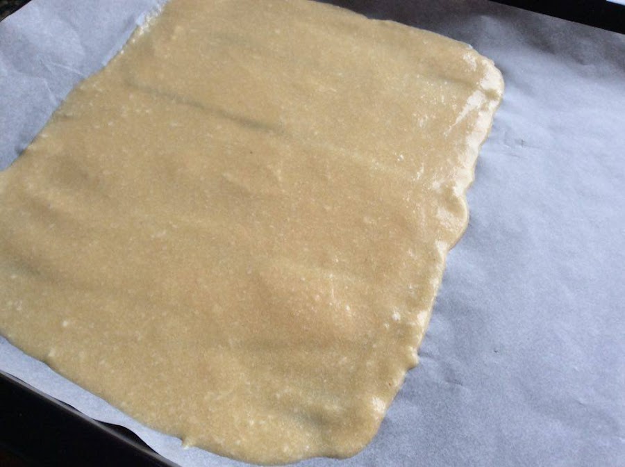Extender la masa en dos bandejas de horno cubiertas con papel antiadherente. Hay que formar bizcochos bastante finos. Yo he hecho uno en una bandeja y, en otra, sólo la mitad de la bandeja. El pequeño, más o menos medía 12x8.