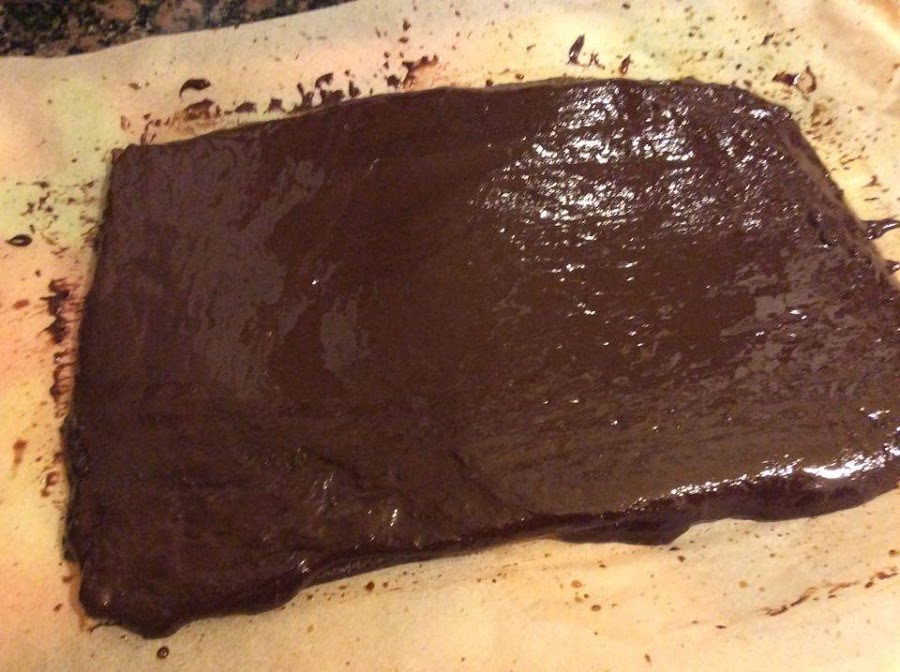 Sobre el bizcocho, ahora, pondremos el garnache de chocolate. Hay que intentar hacer una capa de unos dos milímetros, lo más uniforme que nos sea posible. Nos podemos ayudar con una espátula.