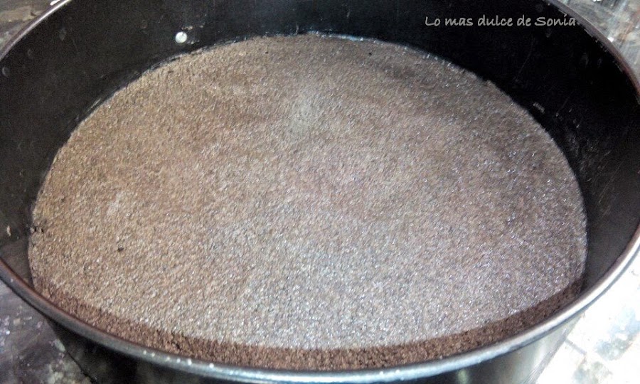 Queda una masa terrosa. Cubrir el fondo del molde con esa mezcla, aplastar bien y meter en el frigorífico o congelador para que endurezca.