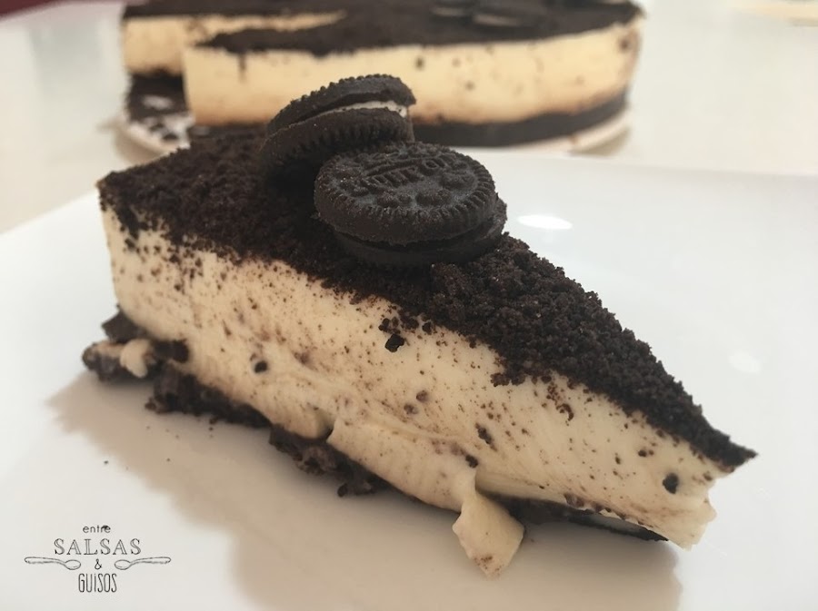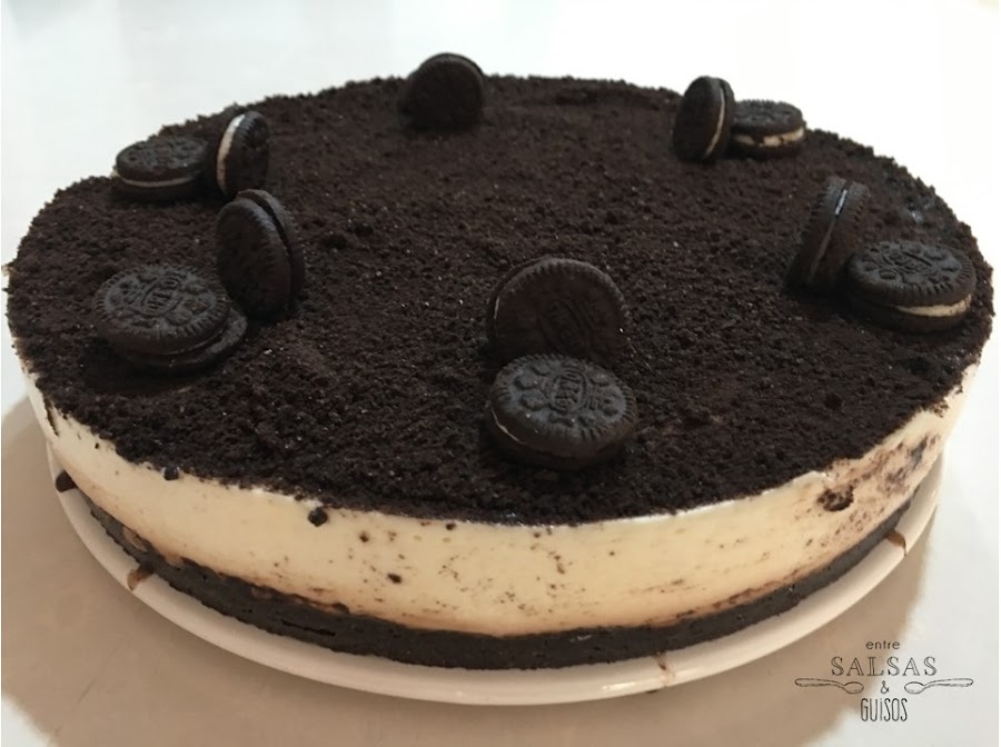 Al día siguiente tritura las galletas sin la crema de relleno con varios golpes de turbo. Esparce la galleta triturada por encima de la tarta reservada y decora a tu gusto, yo lo hice con Oreo ® minis.