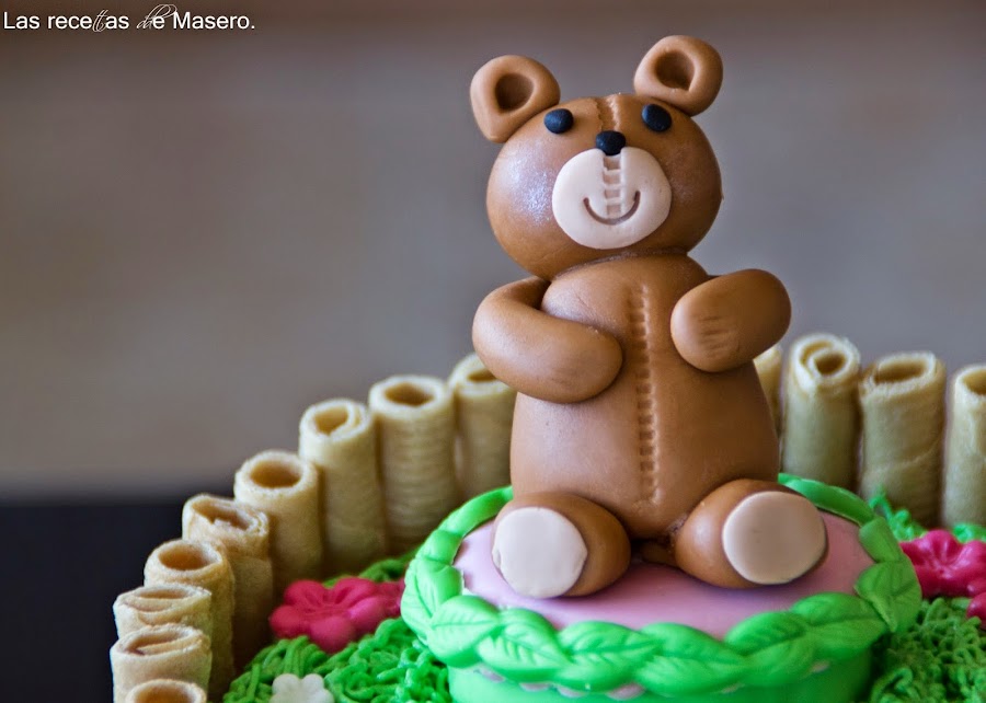 Y hoy os voy a mostrar la tarta que le hice a Carolina, la hija de mi compañera Alicia, que hizo la comunión el pasado mes de junio. En un principio, pensé en hacerle una bonita tarta de fondant decorada con motivos de comunión, pero teniendo en cuenta que le gustan mucho los osos, al final me decanté por otro tipo de tarta, con un bonito oso de peluche como protagonista. He de decir que era la primera vez que modelaba figuras en fondant y que me aterraba ponerme a ello. Siempre he sido pésima en manualidades ( menos mal que a mi madre se le daban bien) y lo sigo siendo, pero la verdad, que me quedó un oso bastante aceptable para ser la primera vez.