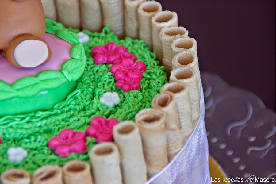 La tarta que rondaba en mi cabeza era toda de fondant, pero tuve un problemilla al cubrir la tarta debido al calor que hacía ese fin de semana y a la falta del rodillo adecuado. La verdad que tuve bastante mala pata, ya que llevamos un verano bastante atípico y elegí el fin de semana para hacer la tarta que más calor hacía, pero bueno son cosas que pasan. Menos mal que me puse a maquinar y al final se me ocurrió una decoración que quedó muy graciosa.