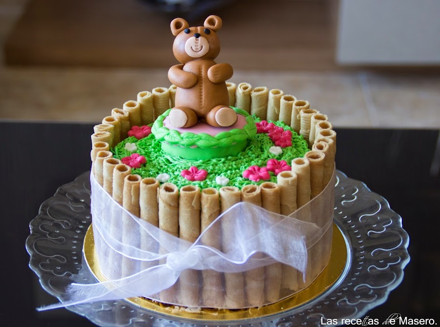 Colocamos nuestra figurita, el lazo alrededor de los barquillos y ya tenemos nuestra tarta lista.