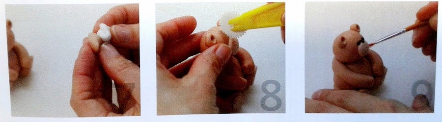 7. Hacemos dos bolitas y las marcamos con la esteca de bolillo, pegándolas sobre la cabeza para hacer las orejas. Preparamos la pasta beige y hacemos tres círculos planos, que pegaremos en el morro y en las patas.