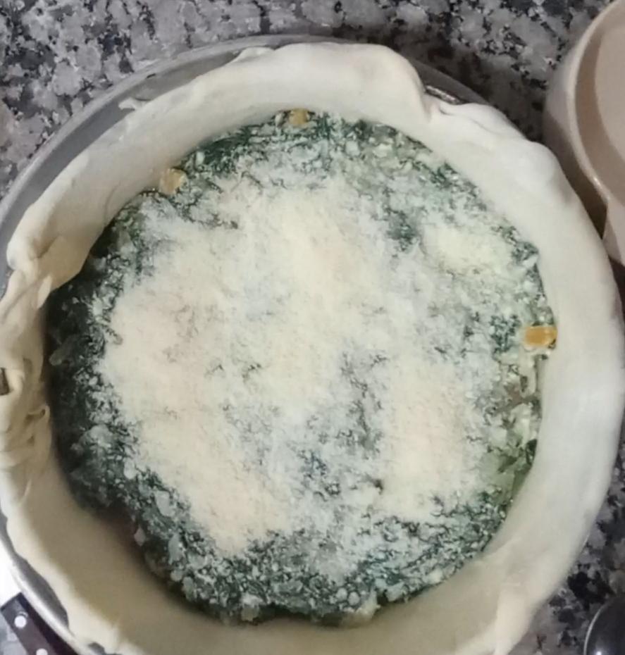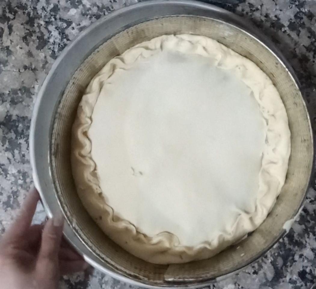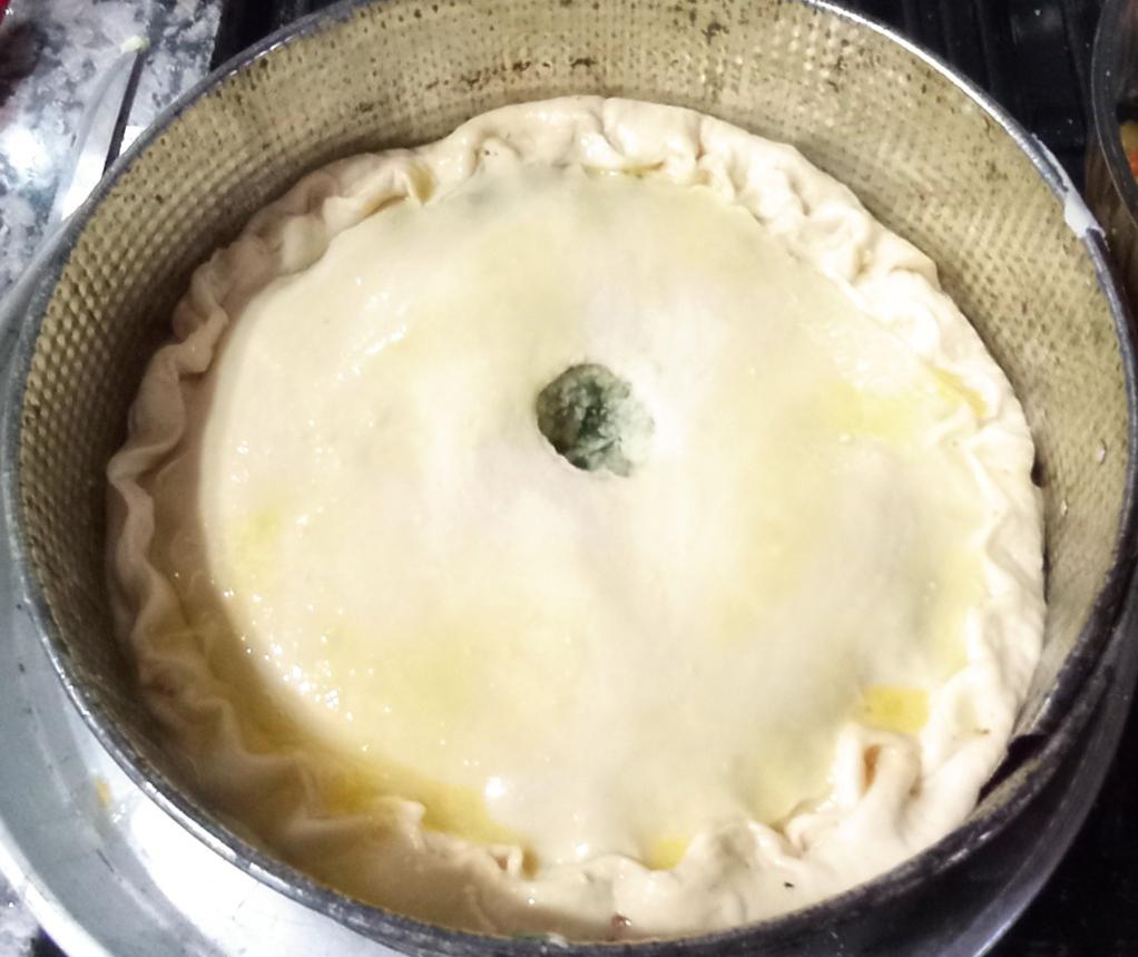 Cubrir la tarta y hacer un repulgue y un agujerito en el medio, llevar al horno hasta que esté cocida y apenas dorada.