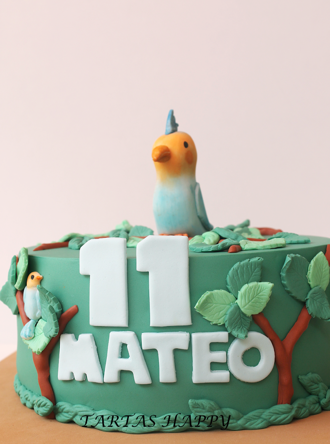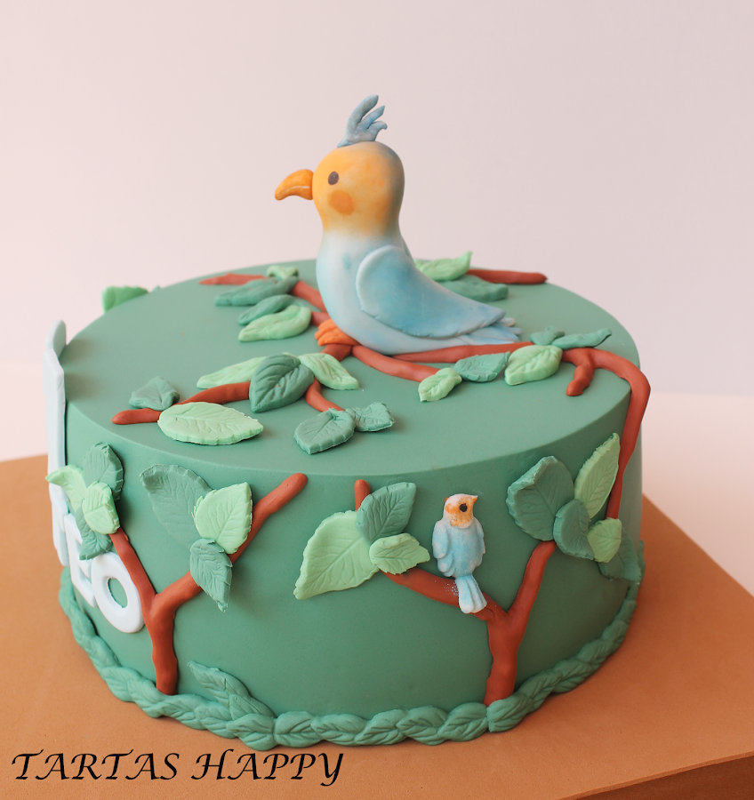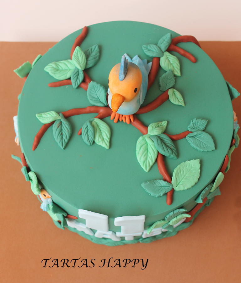 Esta tarta era para un niño al cual le encantan los pájaros y que va salvando pájaros que caen de sus nidos se los lleva a su casa y allí los cuida.