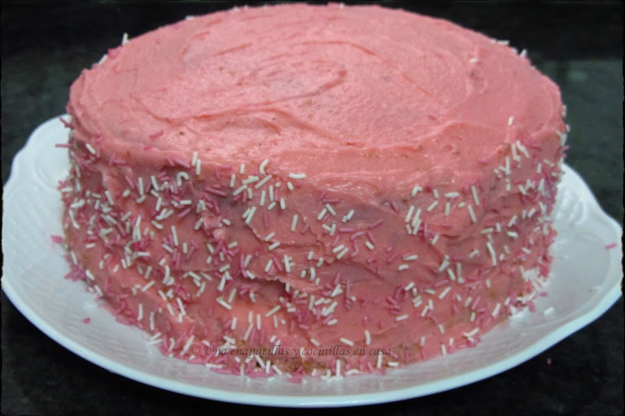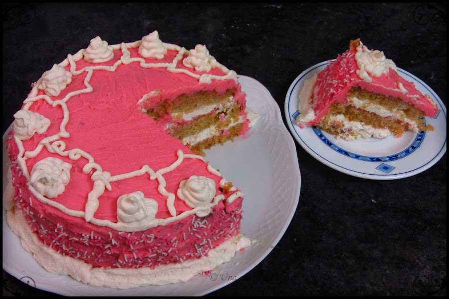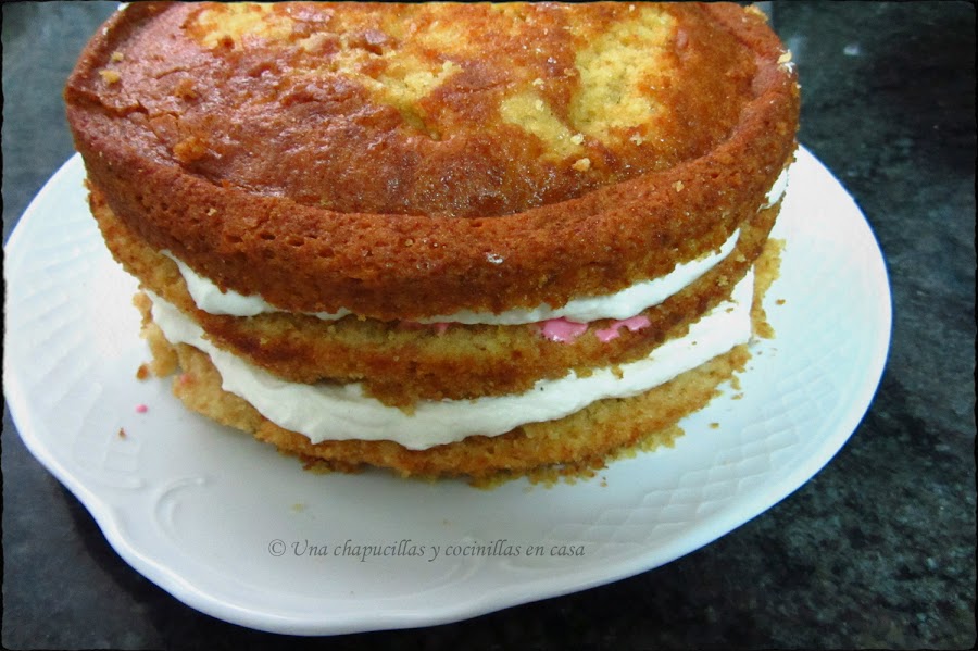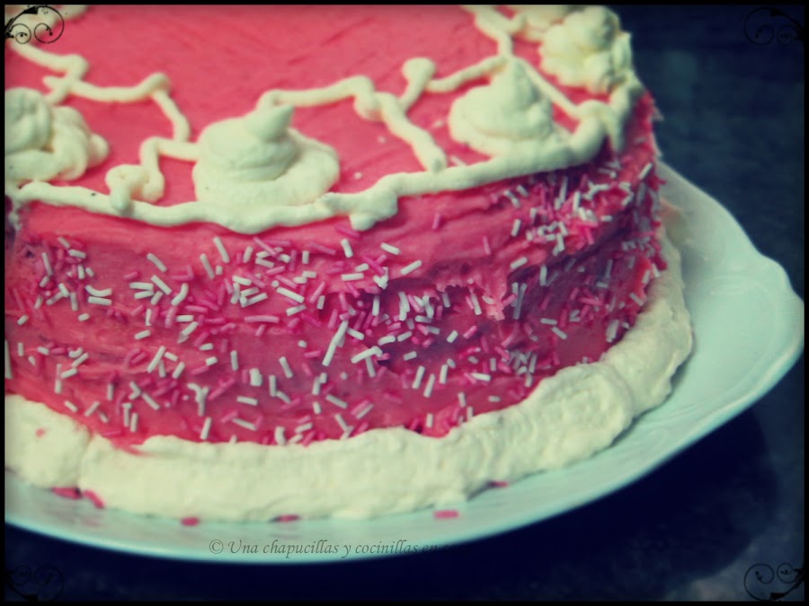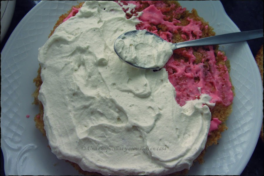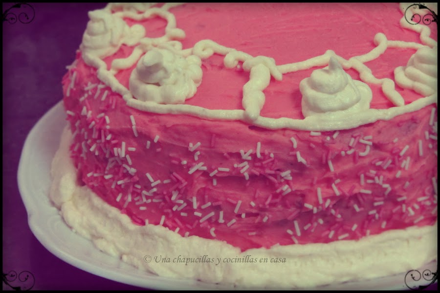Reservé un poco de la nata (crema de leche) del relleno porque era bastante y adorne con ella y unos fideos de azúcar de color rosa y blanco.