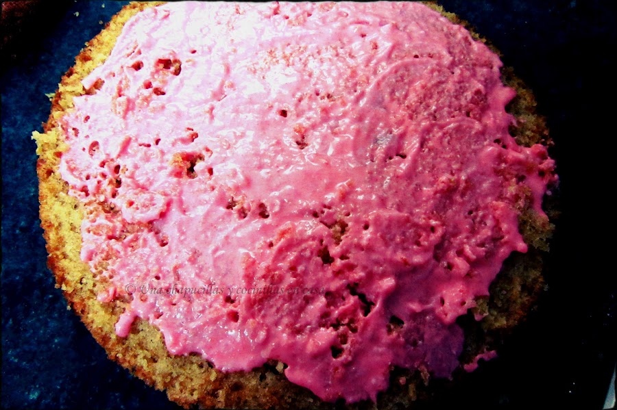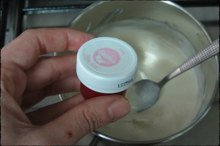 Calentar a fuego lento y añadirle una pizca de colorante rosa. Yo utilicé el de la marca Wilton