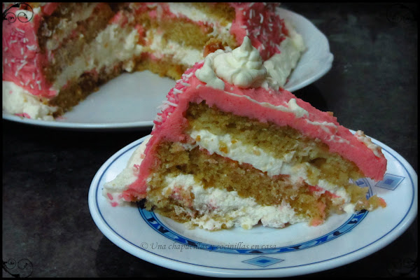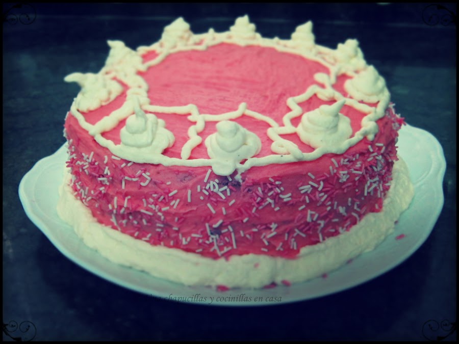 Bueno que me enrollo, pues bien para la cobertura use finalmente chocolate blanco, mantequilla y azúcar glas avainillado y quedo muy bien con un sabor bastante logrado y entre las capas de la tarta puse el sobre de la cobertura del lidl.