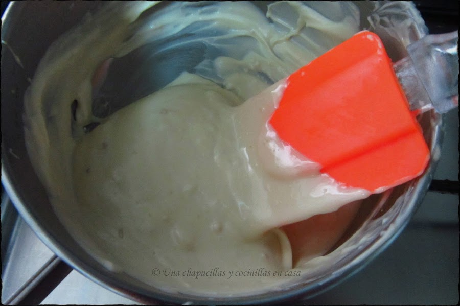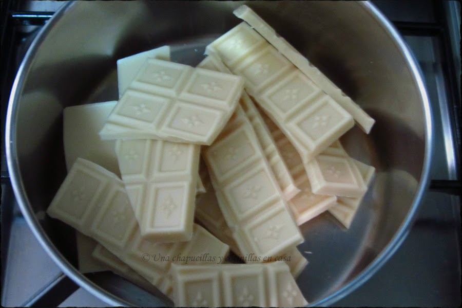 Ir de mientras derritiendo el chcocolate blanco a fuego lento vigilando que no se queme.
