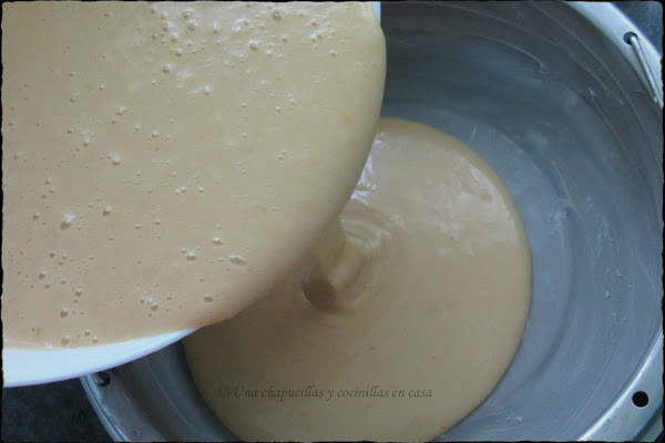 Engrasar un molde de unos 20cm de diámetro aproximadamente y verter la mezcla. Hornear durante 25-30 minutos. Yo utilicé un molde nuevo que debía de transmitir peor el calor que otros que utilizo habitualmente y estuvo casi 1 hora, pero vamos que cada horno es un mundo pero con media hora mas o menos debe estar hecho.