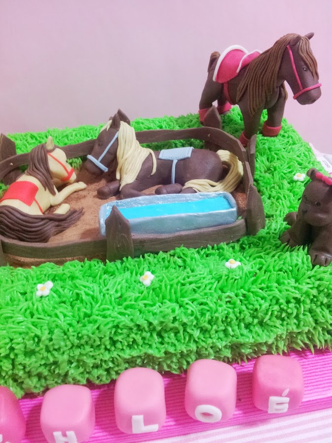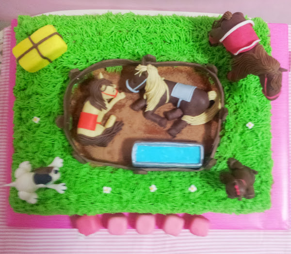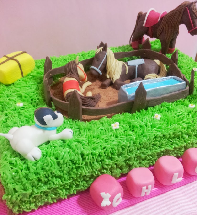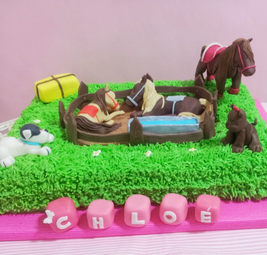 Pero hoy, lo que en realidad vengo a enseñaros son las fotos de la última tarta que he hecho para el cumple de Chloé. Cumplió 2 añitos esta semana y su madre me encargó una tarta que representara lo que le iban a regalar y que estuvieran presentes los caballos y perritos que tienen en su campo y con los que la peque disfruta mucho.