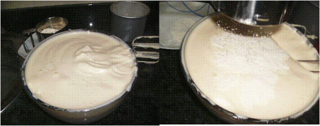 Les añadimos la harina tamizada y con movimientos envolventes mezclamos bien , que no queden gromos con la espátula de abajo arriba.