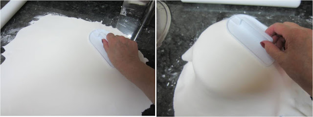 La tarta la tenemos que forrar con mucho cuidado poco a poco para que no queden pliegues y quede los mas lisa posible, cuando la tengamos bien acoplada le cortamos todo lo que sobra de abajo.