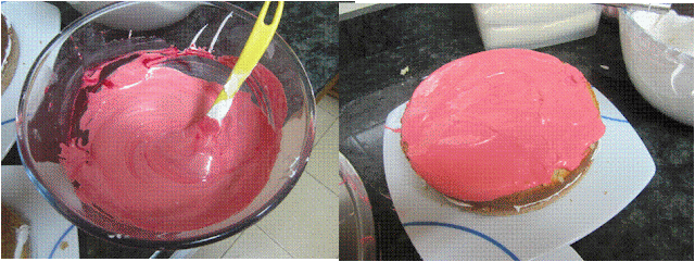 Tape el primer disco relleno y moje con el almíbar un poco el segundo y lo rellene con el de sabor a fresa le añadí unas gotas de aroma de fresa y colorante.