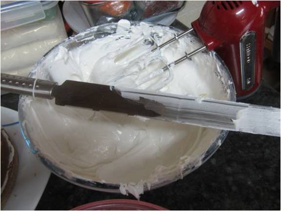 La ultima capa con el blanco de vainilla todo alrededor cubierto para pegar el fondant,