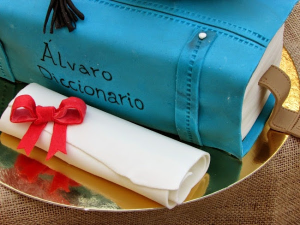 Ya estamos a final de curso, y la graduación de muchos a la vuelta de la esquina. En esta tarta de graduación he pretendido plasmar los detalles de ese momento: diploma, birrete, diccionario ( el graduado en en Literatura).