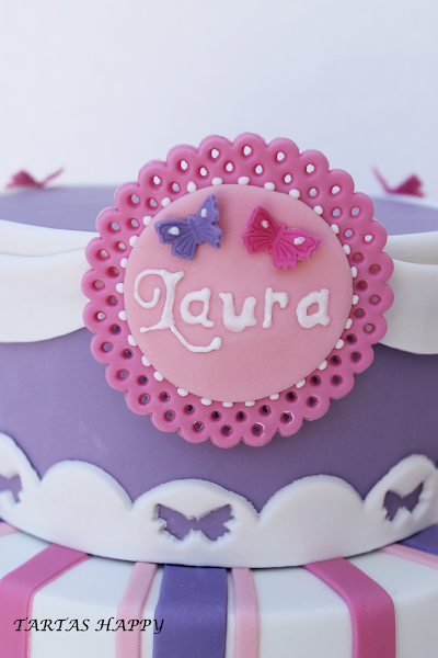 En Abril Laura hizo su primera comunión y su madre me pidió una tarta de tres pisos,tenía que ser en tonos rosas y malvas y que llevara mariposas.