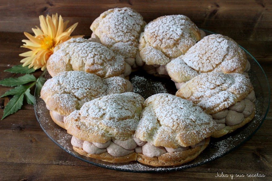 Esta tarta tiene forma de corona, está hecha de masa choux y va rellena de crema, nata (crema de leche)...espolvoreada con almendra laminada, azúcar glas, caramelo...