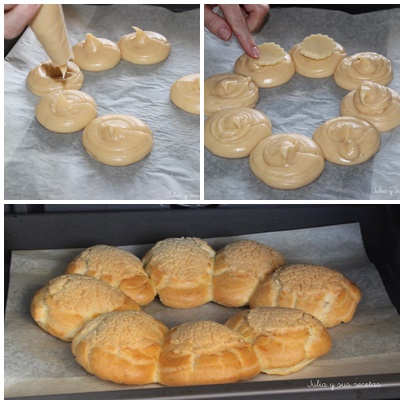 Hacemos la rueda con la masa: haciendo 8 redondeles (ver foto) y encima de cada montoncito ponemos un círculo de galleta congelado. (Ver foto).