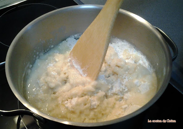 Cuando el líquido del cazo empiece a hervir, añadir de una sola vez la harina, removiendo enérgicamente con una cuchara de madera.