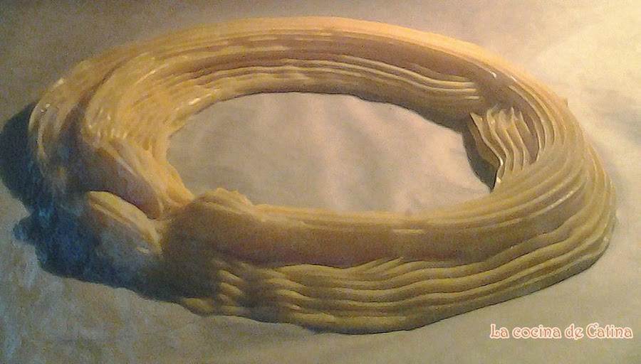 Echamos la masa en una manga pastelera con una boquilla rizada grande. Preparamos una bandeja de horno con papel sulfurizado y hacemos un primer circulo de unos 10 centímetros de diámetro, un segundo círculo por fuera de este y un tercero encima por la línea que une los dos círculos anteriores.