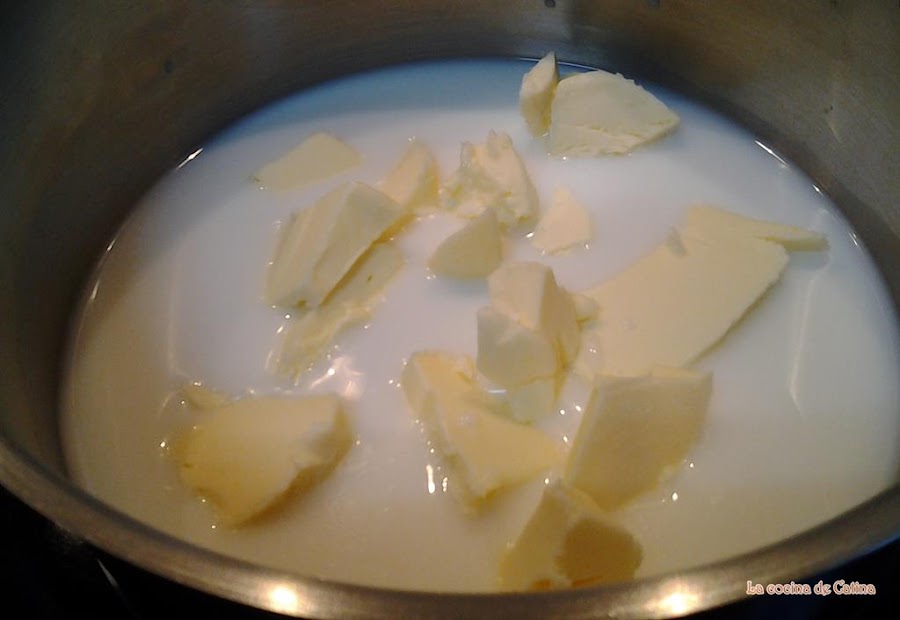 Para hacer la pasta choux sin thermomix, procedemos de la siguiente manera, mezclar en un cazo grande la leche, la mantequilla y la sal y ponerlo a calentar hasta que hierva.