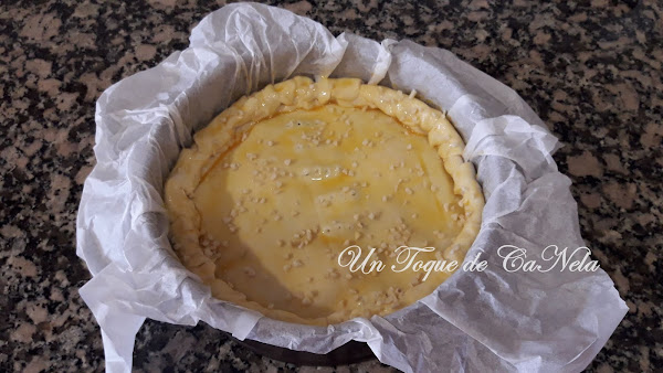 Estirar una de las porciones de la masa, ponerla en el molde, en el fondo y las paredes. He puesto papel de horno mojado y escurrido. Un truco que me enseñó un hornero.