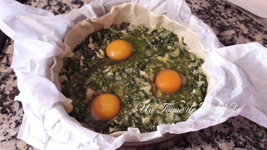 Verter el relleno, hacer 3 huecos y poner en cada uno de ellos un huevo.