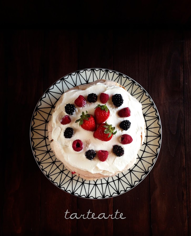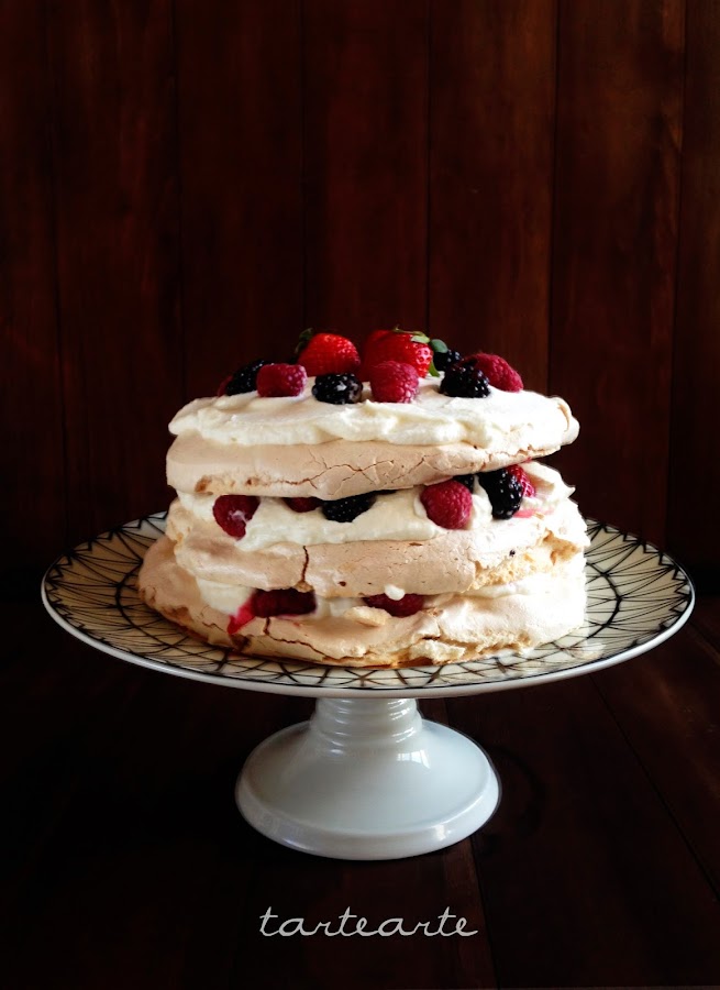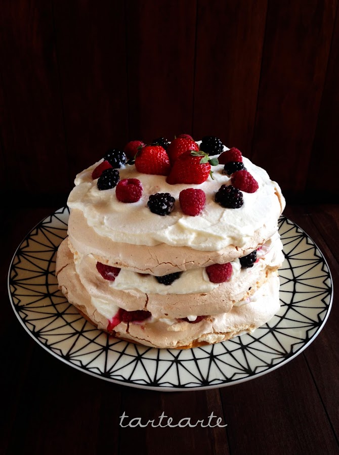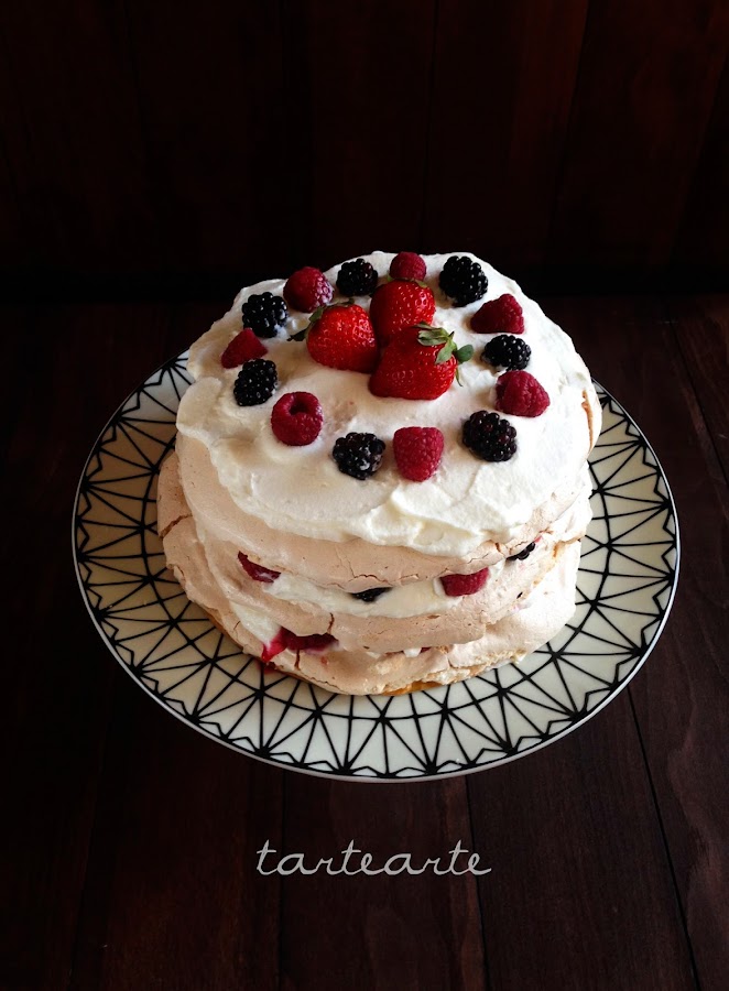 Para montar la tarta, ponemos en un plato o un disco para tartas una capa de merengue (cogerlos con mucho cuidado que son muy frágiles), luego una capa de nata (crema de leche) y unas pocas fresas, moras y frambuesas, con la siguientes capas hacemos lo mismo y en la capa de arriba ponemos los frutos mejor colocaditos para decorar.
