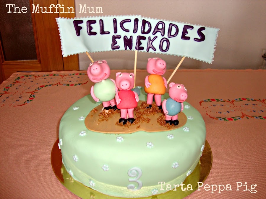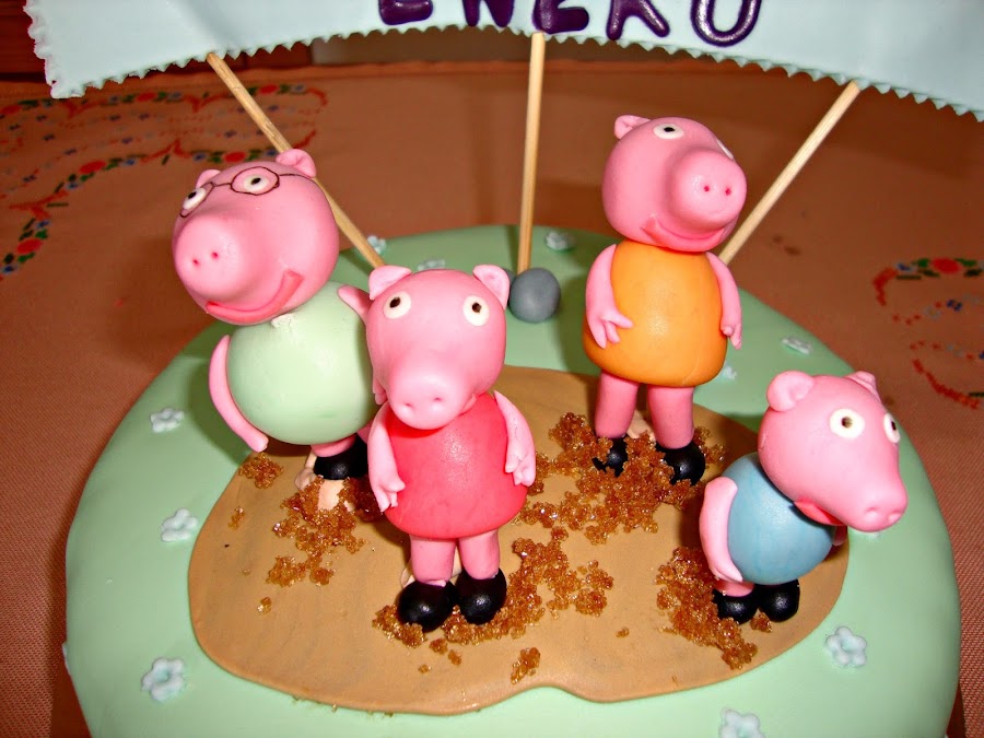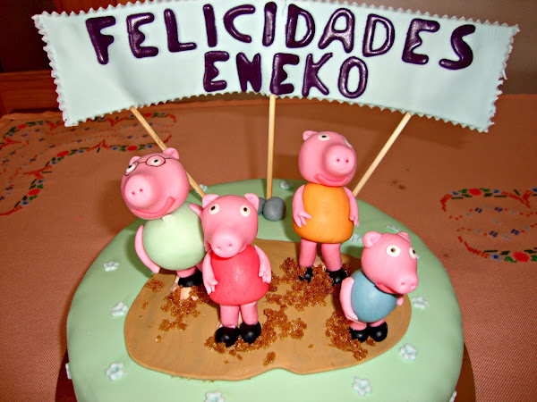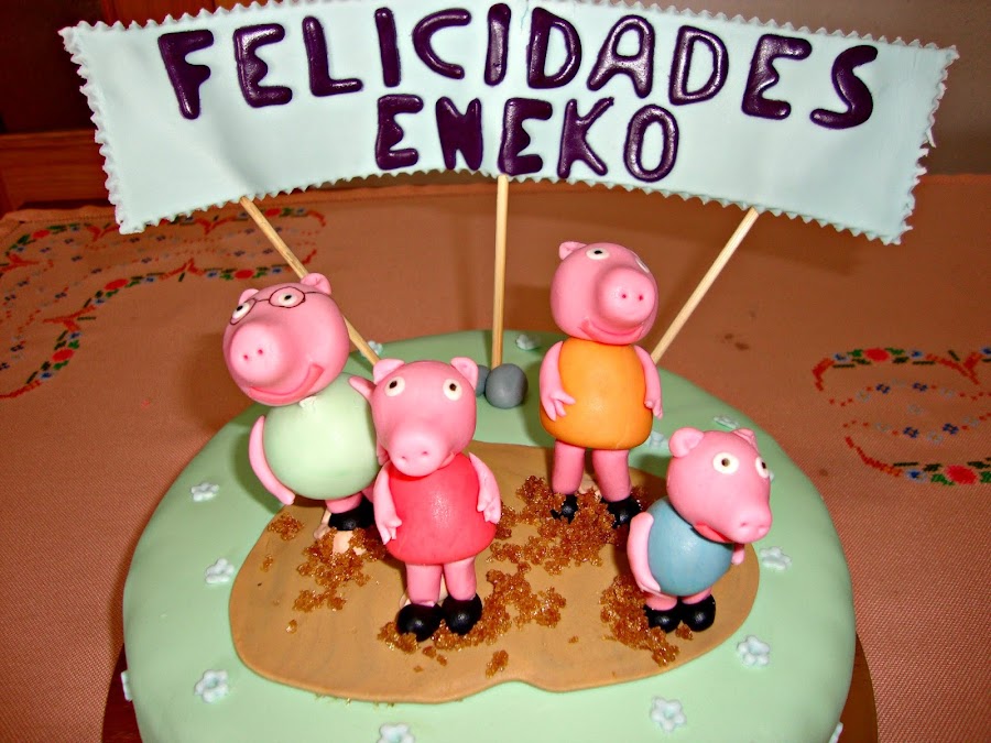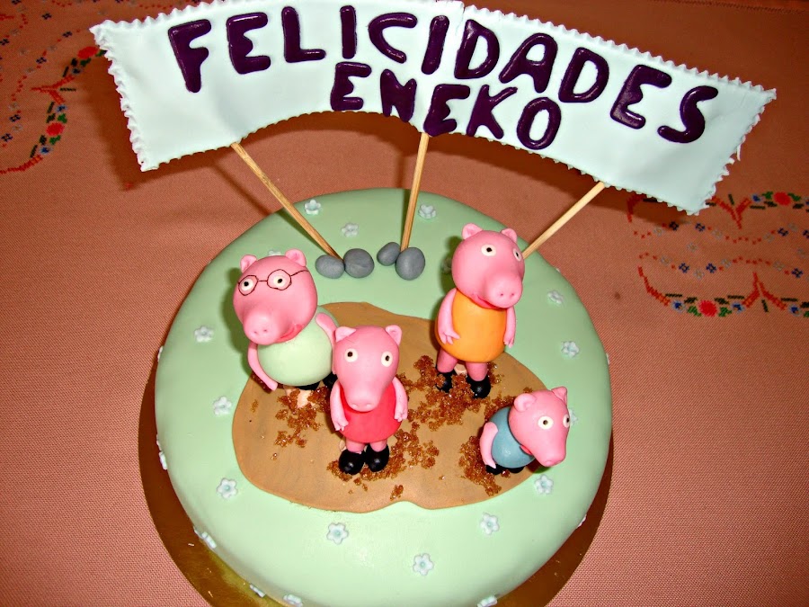 Esta tarta la hice para el tercer cumpleaños de Eneko que le gustan mucho los dibujos animados y especialmente los de Peppa Pig y su mama quiso que estuviesen en su tarta.