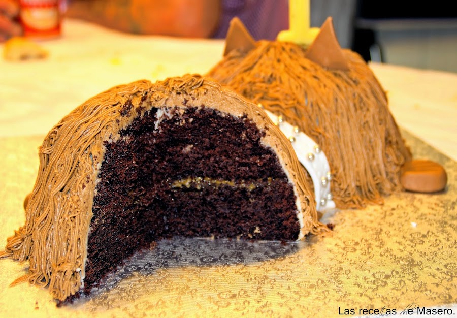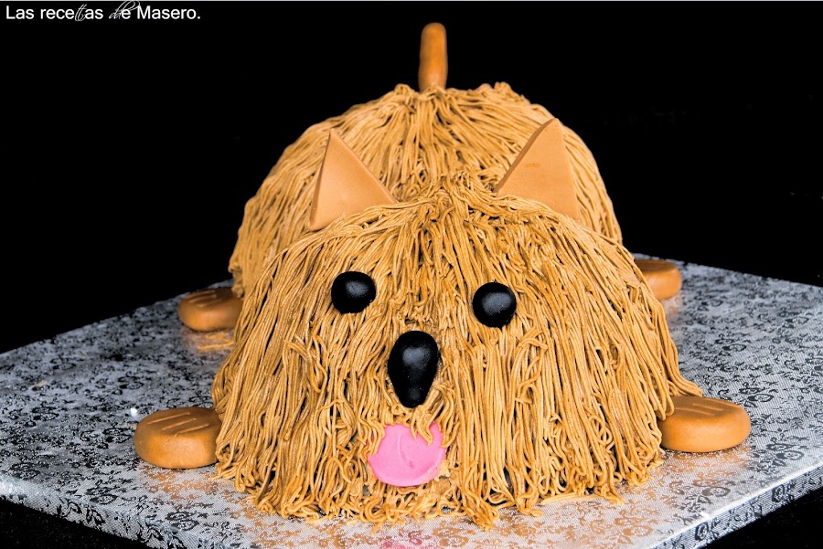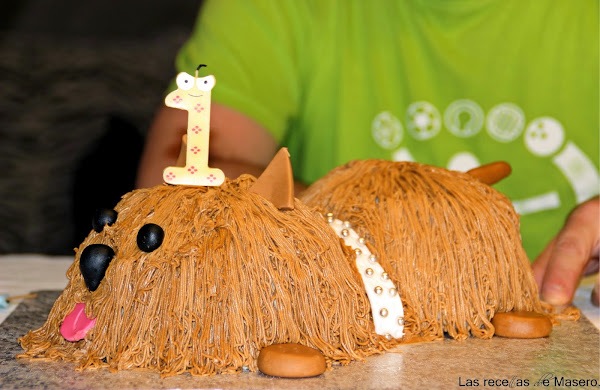 Así que con motivo de su cumpleaños y su gran amor a los perros (teniendo en cuenta que llama perro al 90% de los animales de 4 patas), decidí hacer una supertarta (ya que la ocasión no era para menos) con forma de perro. Menos mal que no le ha dado por los armadillos porque si el perro me costó, no se como me las hubiese ingeniado, aunque por mi sobri, hago lo que sea.