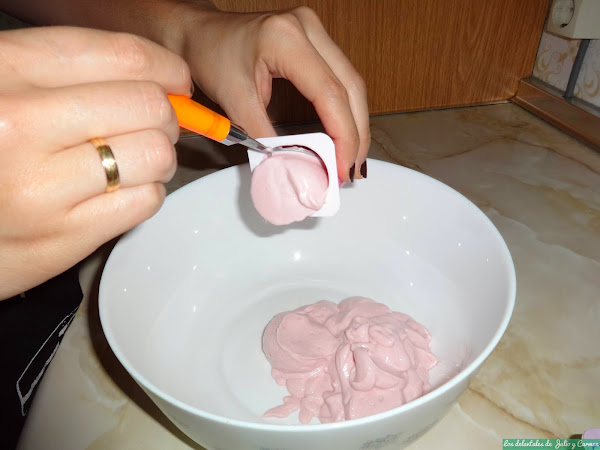 En un bol, uniremos los petit-suise, la nata (crema de leche) y el azúcar, mezclando todo bien.