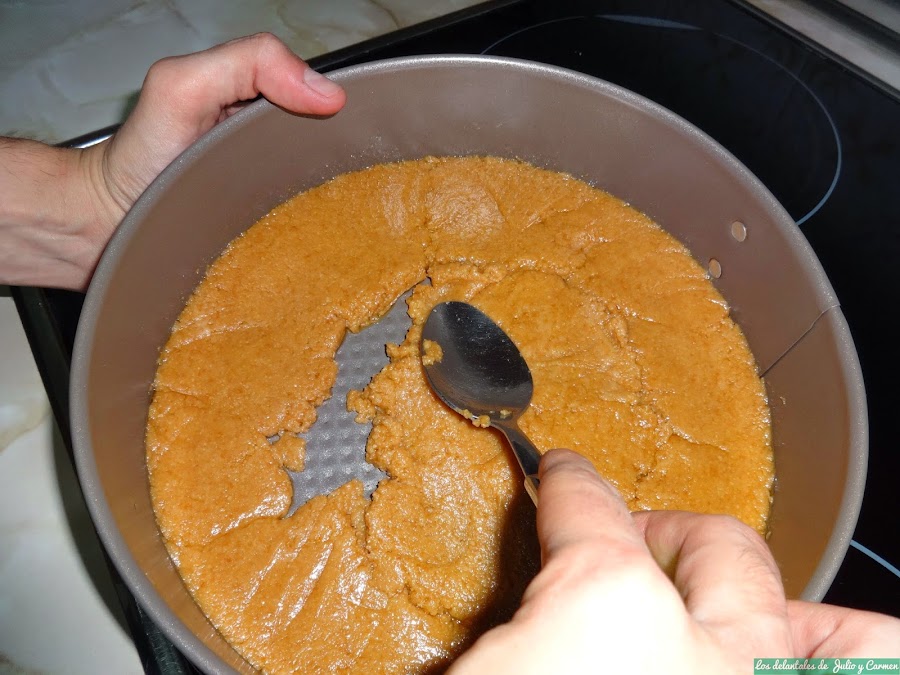 Extenderemos la galleta en el molde, aplastando y alisando la superficie (especial cuidado de que los bordes estén bien cubiertos), formando así la base de la tarta. Dejaremos en el frigorífico mientras continuamos.