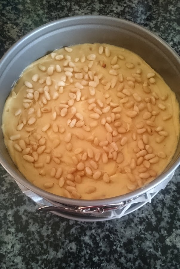 Engrasamos nuestro molde y precalentamos nuestro horno a 180 grados. Vertemos la masa y la aplanamos con la ayuda de una espátula. Decoramos con los piñones sin tostar y si queréis agregar más pues adelante! A mí con 20 gramos me vino bien.