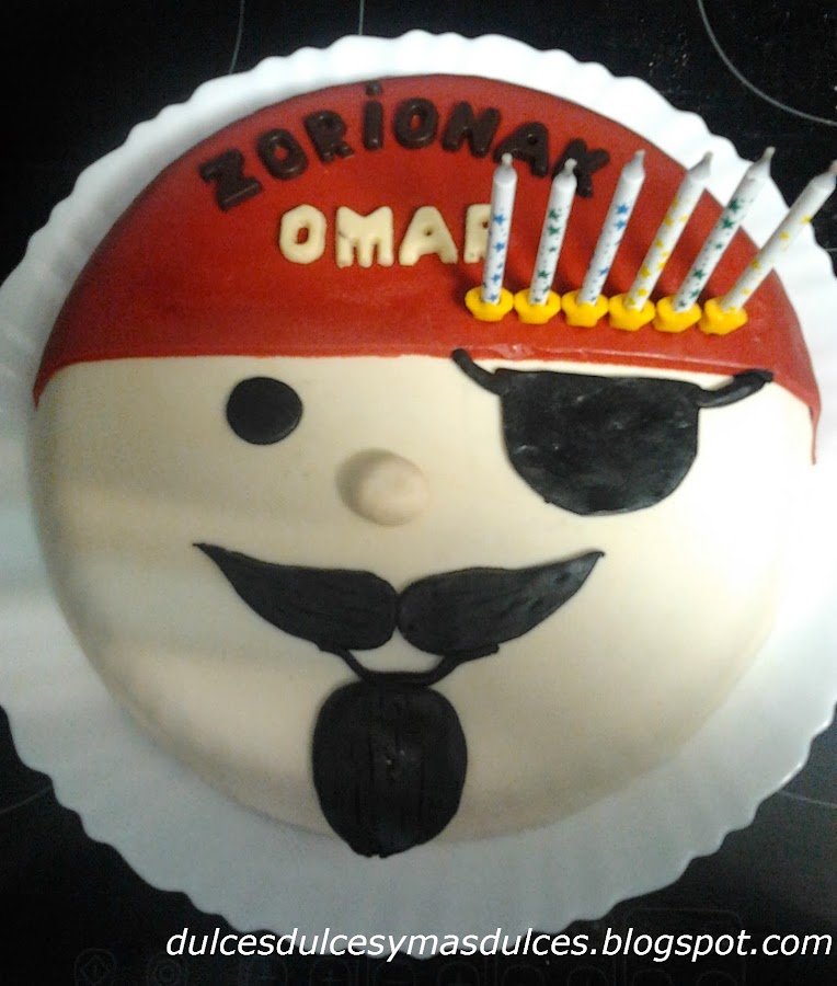 Os presentamos una tarta fácil de hacer pero que sorprende a tod@s... sobre todo a los niñ@s!! Es un bizcocho básico de yogurt de 25cm de diámetro, relleno de crema pastelera y decorado con fondant de colores que forman la cara de un pirata. A continuación, explicamos, paso a paso, cómo lo hemos hecho: