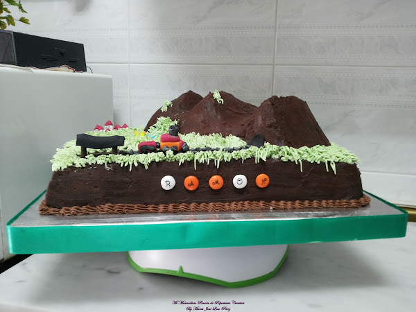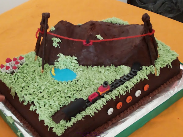 Con cuatro años le encantaban los teleféricos y se me ocurrió hacer una tarta con uno. También llevaba un trenecito y un pueblo ¡Todo comestible! Los cables del teleférico eran de regaliz, y los postes donde estaban enganchados, los construí con chocolate fundido y palitos de Mikado.