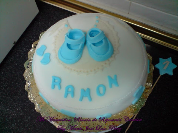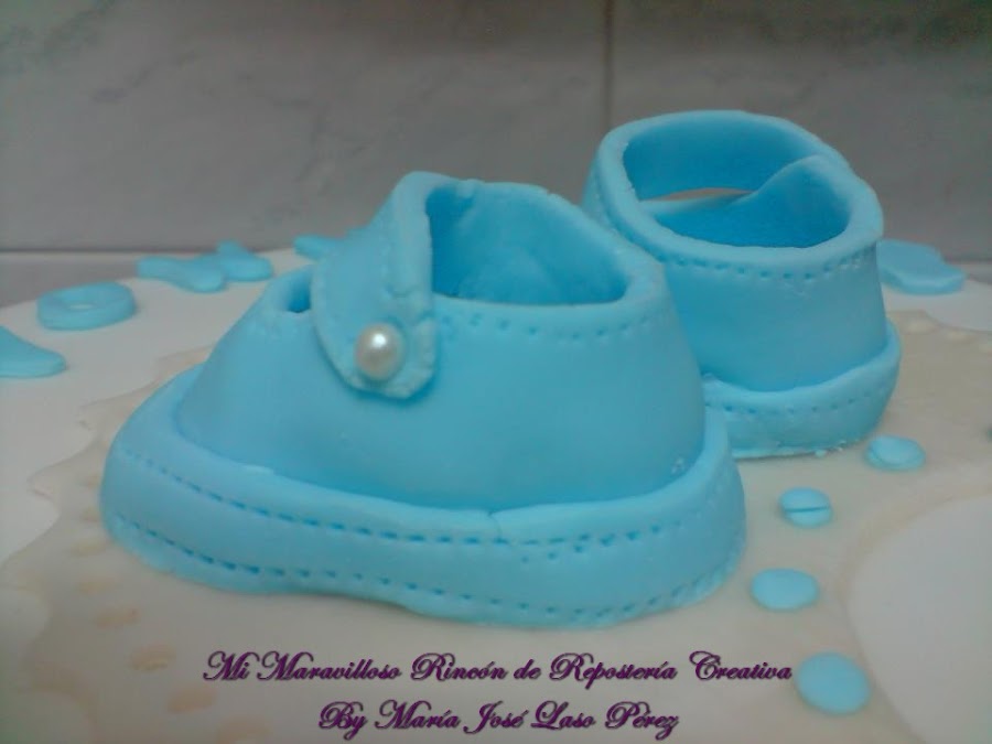 ¡Cómo crecen! Si parece que fue ayer cuando le hice la primera tarta de cumple con un añito. La recuerdo perfectamente, era de fondant, fondo blanco y decoraciones en azul, con unas alas alrededor de la tarta, en la parte superior un babero de encaje y encima de éste unos zapatitos de bebé en azul celeste a tamaño real. ¡Era preciosa!