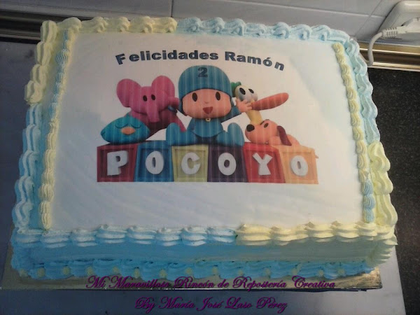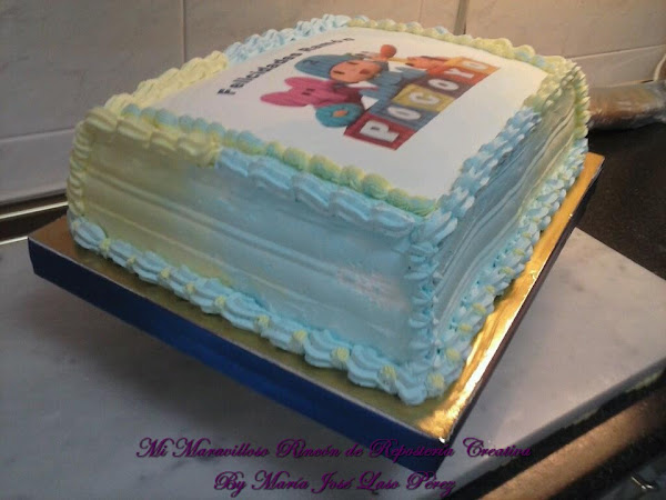 La verdad es que me acuerdo de todas las tartas que he hecho, porque las he personalizado yo misma y sobre todo las he puesto mi marca personal, por eso no hay dos iguales, je,je,je. La de los dos añitos fue de Pocoyó, Realizada con una impresión de azúcar. Los colores en tonos pastel, quedaron de maravilla.