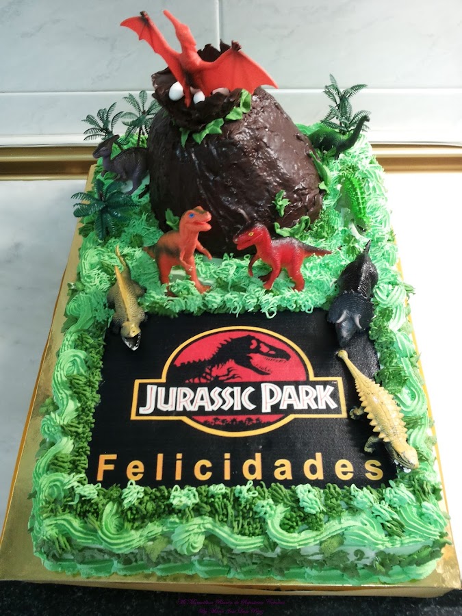 La tarta de cumpleaños de los cinco años era de Parque Jurásico, esta peli nos impactó a todos. ¡A los peques les volvían locos los enormes dinosaurios!