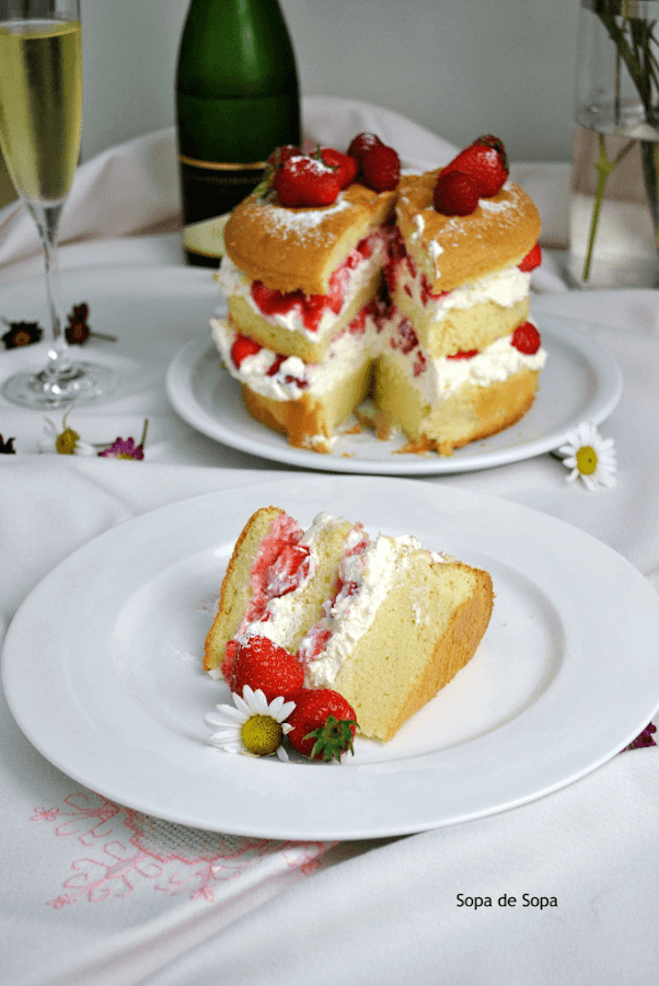 Desmoldar el bizcocho y cortarlo en tres partes iguales en horizontal.