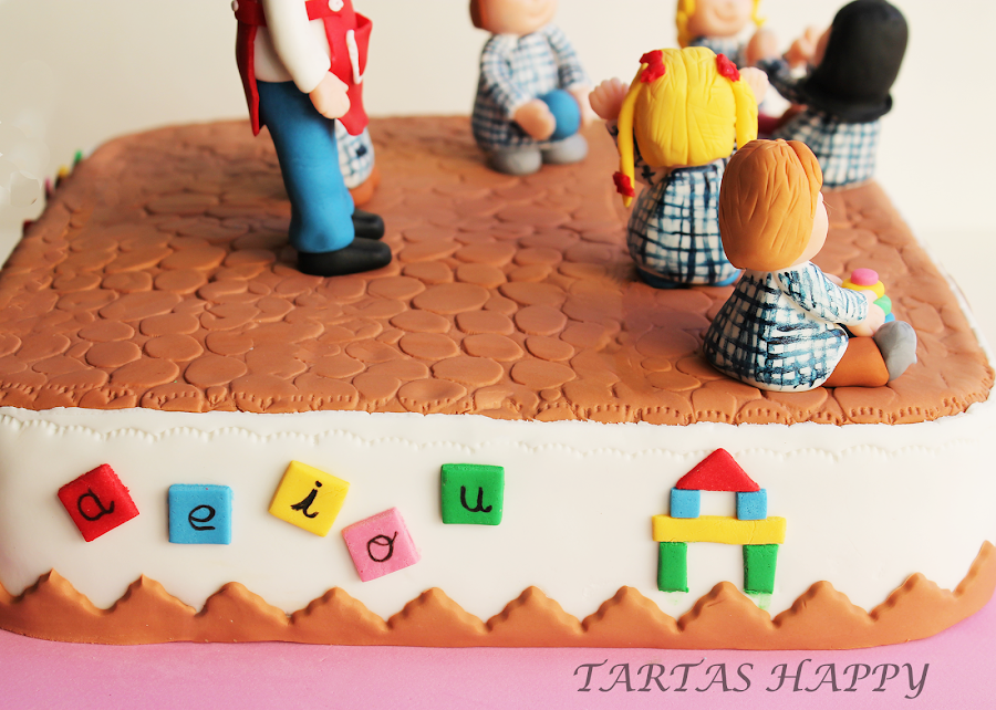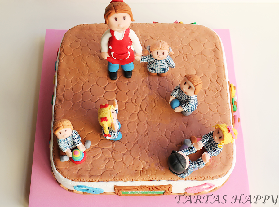 Esta tarta me la encargó mi compañera de trabajo para su hija que es profesora en una guardería y como a ella le apasiona su trabajo quiso reflejarla haciendo lo que hace habitualmente en él ,se me ocurrió ponerla cuidando a unos niños en el patio de la guardería, ella me dijo como van vestidos tanto su hija como los niños para que se viera lo más realista posible.