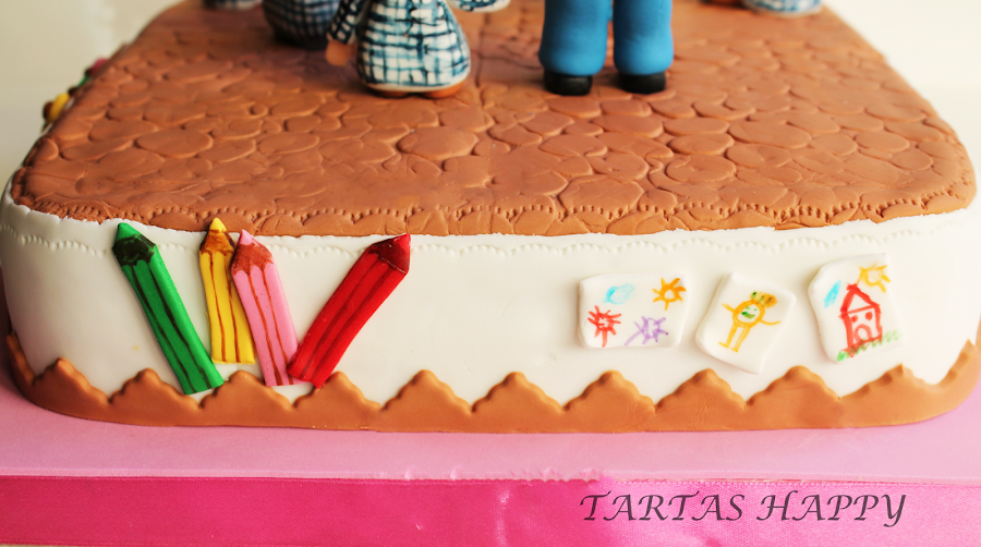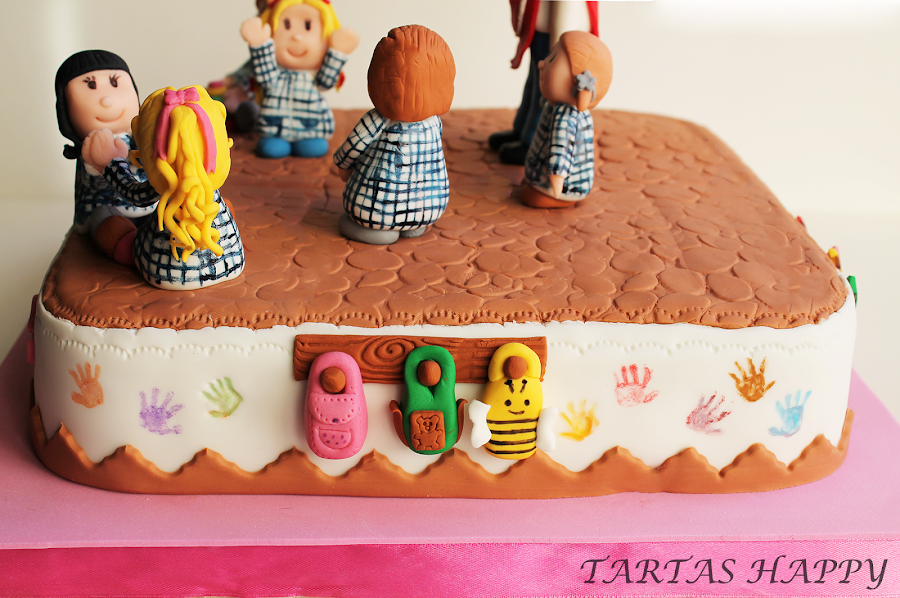 Alrededor de la tarta van cosas que normalmente hay en una clase,en esta foto podemos ver las mochilas colgadas de la percha y unas manos decorando la pared,lo curioso de las mochilas es que la hija le dijo que en la clase había un niño con la mochila de abeja que cómo lo sabíamos y la verdad es que fue casualidad.