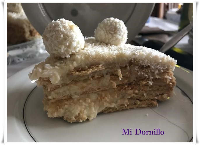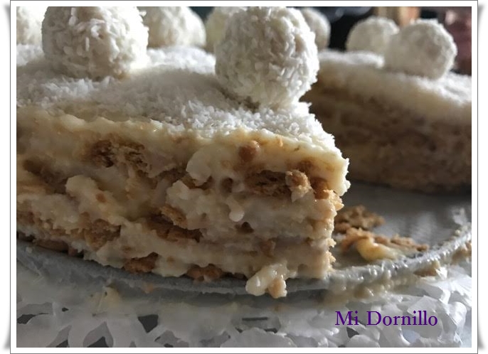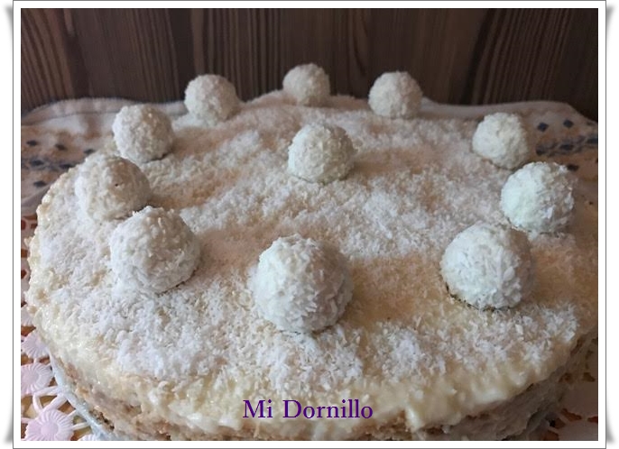 -Pondremos una 1ª capa de galletas y encima una de crema, otra de galletas, otra de crema, y así hasta terminar con crema, que espolvorearemos con coco rallado. Metemos en la nevera hasta el día siguiente, que la adornaremos con mas coco rallado si hace falta y los bombones Raffaello.