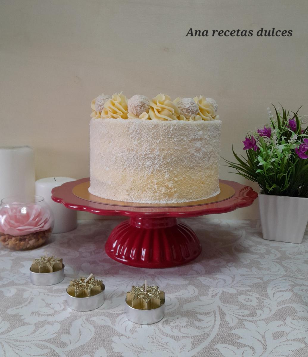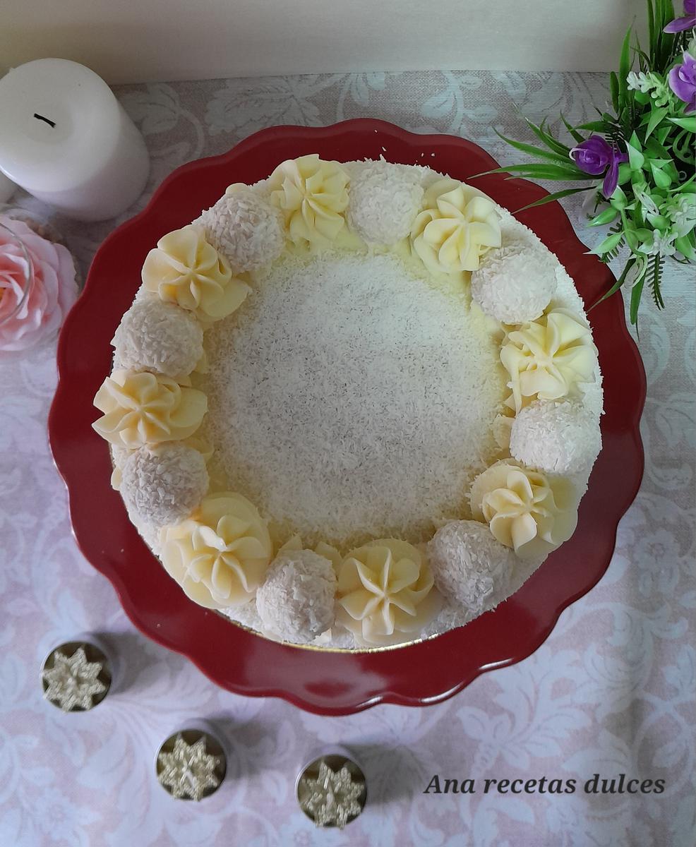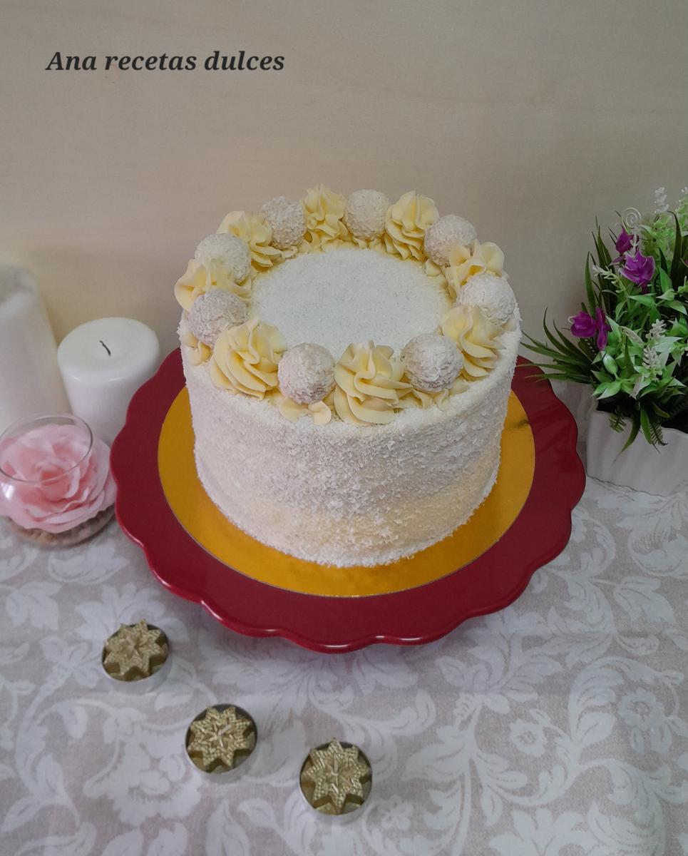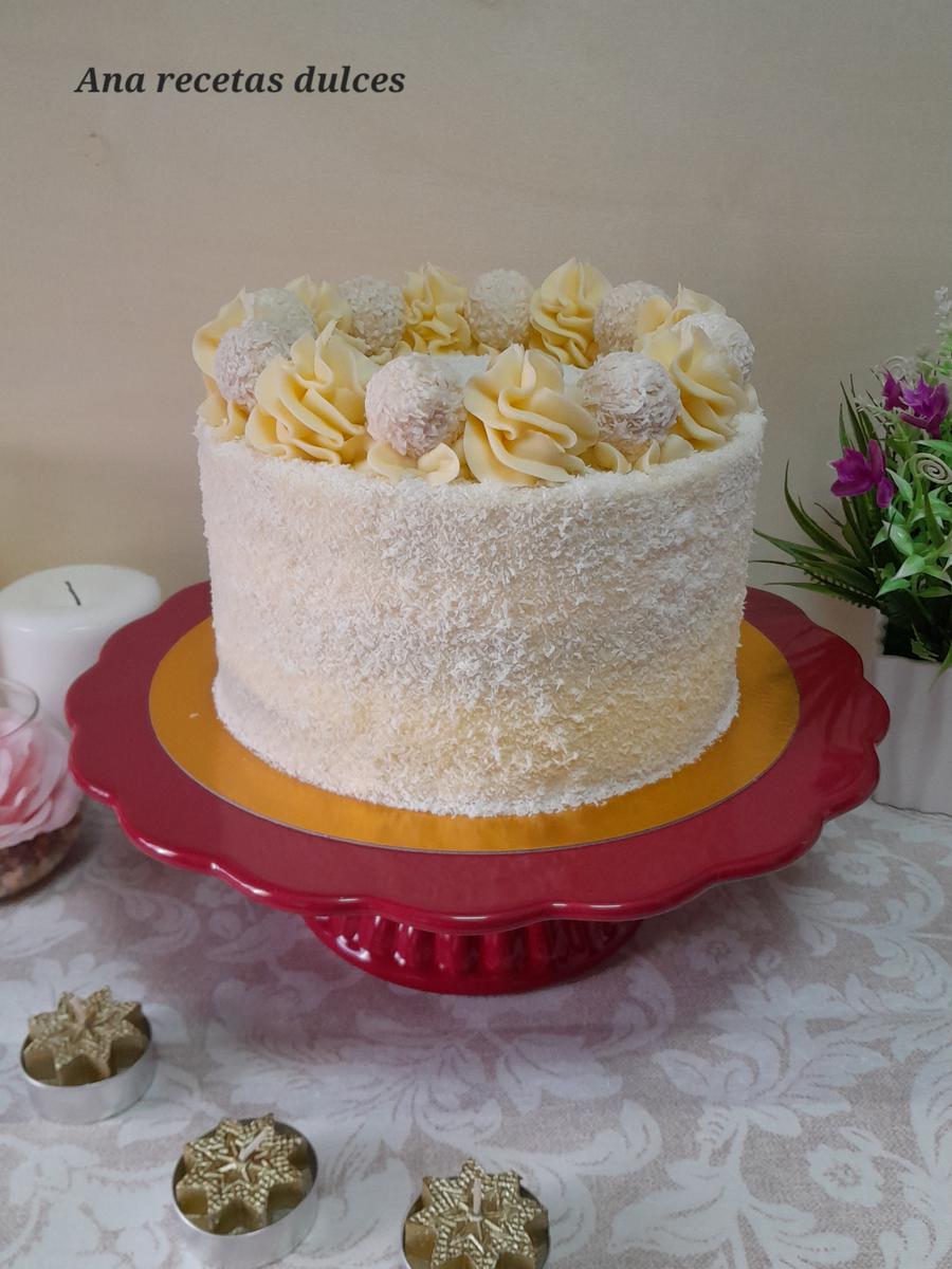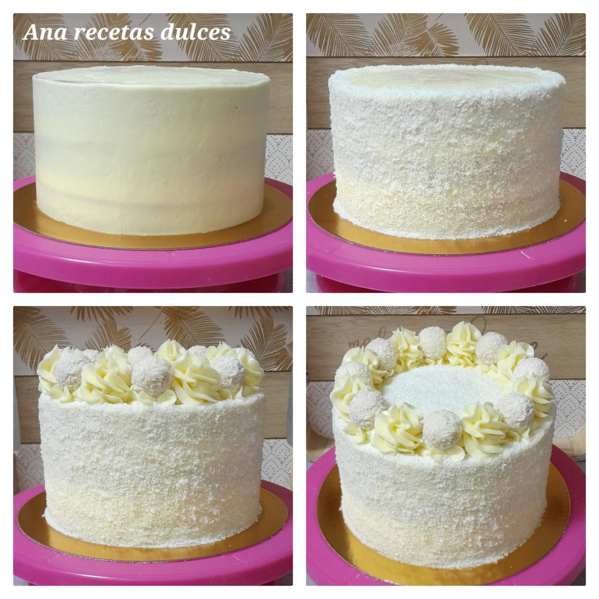 Introducimos el resto del la buttercream en una manga pastelera con una boquilla (yo he utilizado la 1M de Wilton), hacemos copetes por todo el borde de la tarta y entre copete y copete ponemos un bombón raffaello (para pegar el bombón a la tarta, pondremos un pegotito de buttercream y encima el bombón), terminamos espolvoreando coco rallado por toda la superficie de la tarta.