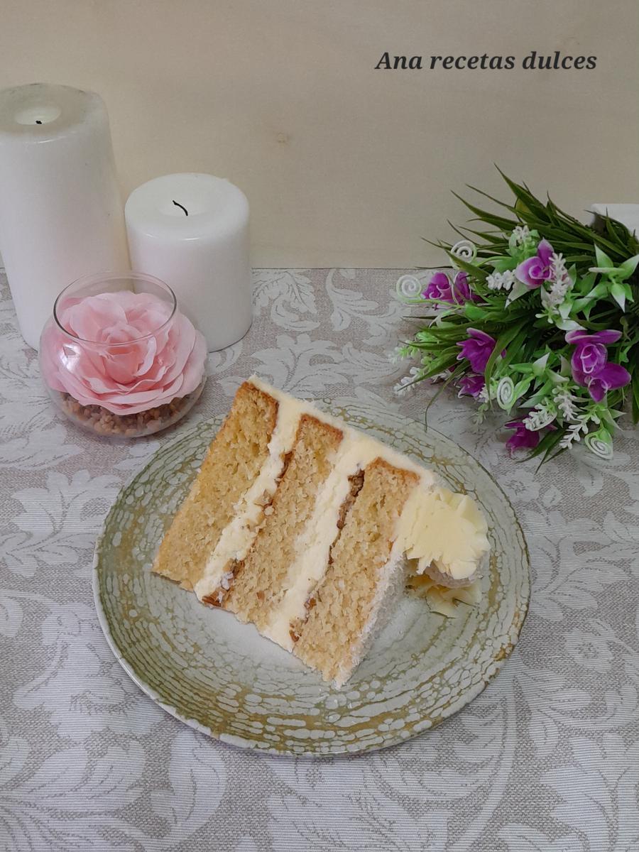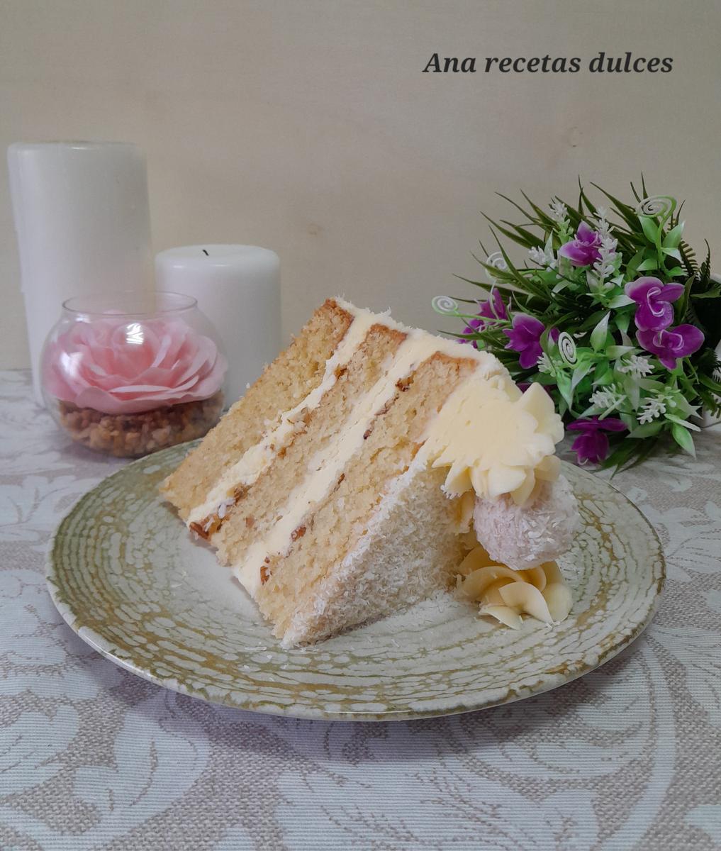 Una tarta de coco con un sabor increíble, con una miga tierna y esponjosa y un suave y cremoso relleno sabor a chocolate blanco.